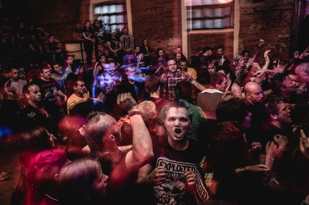 Концерт популярной в 90-х русской панк-группы в одном из клубов Петербурга.Саня «Цой»: «Ты можешь спокойно называть себя панком, но при этом не быть анархистом, а быть просто antisocial (прим. ТД – антисоциальным), не придерживаясь никаких идей, мыслей и ловить только нигилистическую волну из всего этого. А что значит быть антисоциальным в наше время? Это значит стать либо дауншифтером, уйти в лес, куда-нибудь в Сибирь, и строить там себе хижину. Либо в современном обществе просто потреблять, воровать, пить… Большинство выбирает второй путь, потому что он попроще будет».Фото: Ксения Иванова/фотоконкурс "Прямой Взгляд"