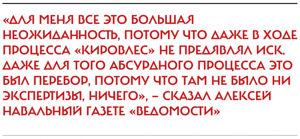 Алексей Навальный сообщил, что предприятие «Кировлес» подало к нему иск с требованием возместить ущерб в размере 16 млн рублей. Также ответчиками являются предприниматель Петр Офицеров и экс-директор предприятия Вячеслав Опалев. Как пояснил адвокат Навального Вадим Кобзев, «это те 16 млн, в хищении которых они обвинялись» по «делу Кировлеса».