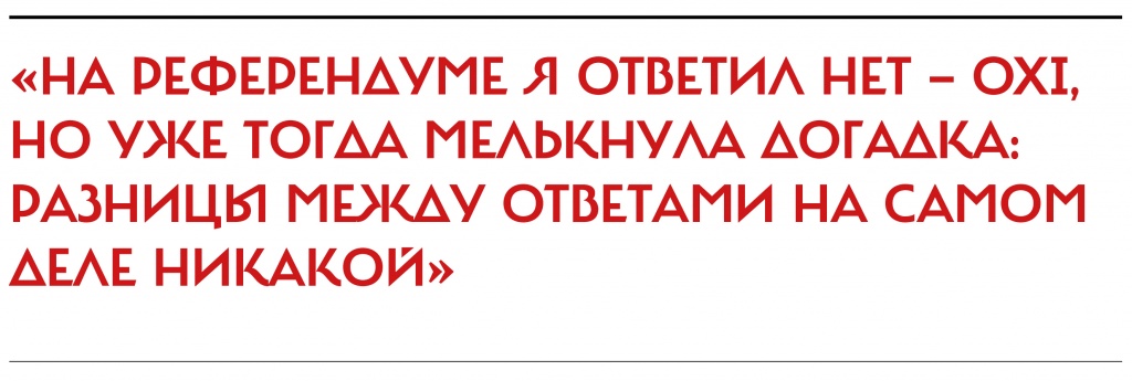 Георгиос вспоминает 5 июля 2015 года, когда в Греции прошел затеянный экс-премьером Алексисом Ципрасом референдум — «Принимать или нет условия еврокредиторов?». «На референдуме я ответил нет — oxi, но уже тогда мелькнула догадка: разницы между ответами на самом деле никакой». Так и получилось: Ципраса сейчас поддерживают те, кто в июле сказал Европе да — nai.