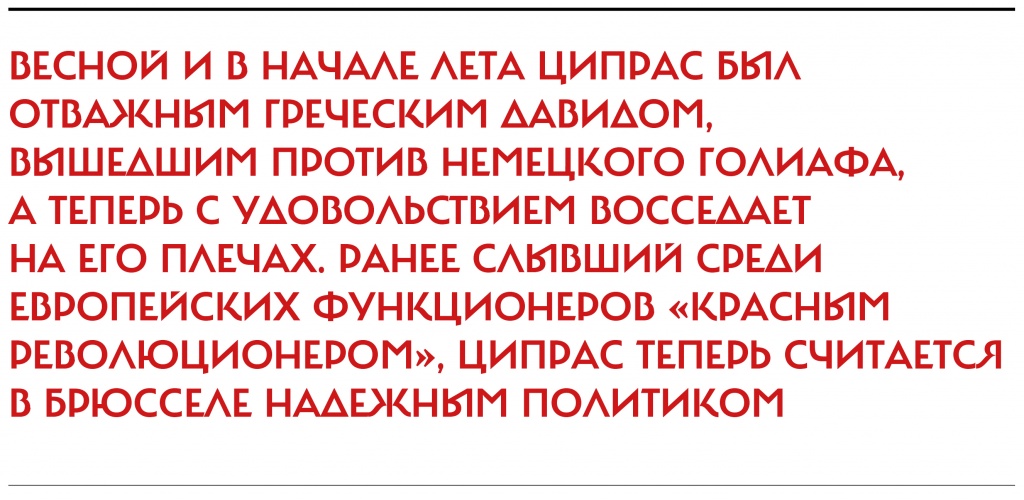 Афины. «Стена несогласия» с условиями еврокредиторов — тема уличного граффитиНовый дискурс По традиции с программными речами греческие политики выступают на открытии торговой ярмарки в Салониках в начале сентября. В сентябре 2014-го Ципрас выступил здесь с программной речью в качестве лидера оппозиции, пообещав, в частности, положить конец приватизации и повысить минимальную оплату труда. В этом году Ципрас предстал в новом образе. Понятно, что из-за пустой казны ему пришлось сбавить тон и предложить избирателям вместо 300 тыс. новых рабочих мест, как в прошлом году, лишь «150 тыс. временных трудовых договоров для молодых безработных». Проблема в том, что самой «салоникской программе»–2015 многие не придали особого значения. Потому что с середины июля в речах Ципраса изменился дискурс: перед Грецией и всей Европой он предстает в новом образе. Теперь он снижает пенсии, зарплаты, социальные пособия, готов распродать одну госсобственность и вовсе ликвидировать другую, либерализовать экономику и разрешить массовые увольнения работников. Весной и в начале лета он был отважным греческим Давидом, вышедшим против немецкого Голиафа, а теперь с удовольствием восседает на его плечах. Ранее слывший «красным революционером», Ципрас теперь считается в Брюсселе надежным политиком.