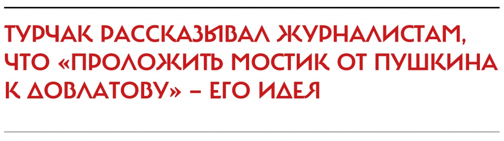Год назад Андрей Турчак был ключевой фигурой масштабной презентации фестиваля. Рассказывал журналистам, что «проложить мостик от Пушкина к Довлатову» — его идея. Он ведь вообще модный, прогрессивный, молодой (и на самом деле молодой, всего 39 лет). Обустраивает парки и велодорожки в городе в рамках программы «Туристско-рекреационный кластер «Псковский». Собирался сделать Псков столицей русской масленицы. Планирует в 2019 году Ганзейские дни с немалым бюджетом. Довлатовский фестиваль с участием звезд литературы, кино и театра вполне логично смотрится в этом ряду.