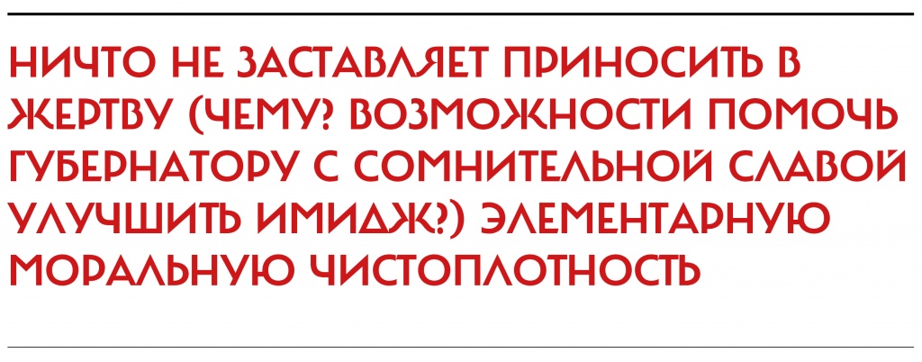 Тут легко увидеть, как желание не ссориться с заказчиком — с любым заказчиком, — желание быть востребованным (и получить положенную благодарность, разумеется), толкает людей — безусловно, талантливых людей, к банальнейшим передергиваниям. Отчего же не ездить — ездить. Вот только разве власть — обязательный посредник между производителем культуры и ее потребителем? Пока еще нет. Даже в сегодняшней России — нет. Ничто не заставляет приносить в жертву (чему? возможности помочь губернатору с сомнительной славой улучшить имидж?) элементарную моральную чистоплотность. Не видно пока ни очередей за академическим пайком, ни кровавых чекистов, готовых карать за любое неаккуратное слово. Карать, конечно, карают, но пока не за любое и чаще все-таки не мастеров культуры. Некоторые просто слишком уж загодя начали готовиться.