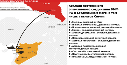 Опасные маневры Несмотря на присутствие мощной оперативной группировки российского флота в Средиземном море, в прессе уже циркулируют слухи об отправке к сирийским берегам тяжелого авианесущего крейсера «Адмирал Кузнецов» и эскадры из пяти боевых кораблей с крылатыми ракетами на борту. «Маневры у берегов Сирии — это демонстрация флага, должна показывать готовность России в случае необходимости провести боевую операцию», — полагает эксперт. По его словам, порт в Тартусе постоянно принимает большие десантные корабли, легко вмещающие батальон морской пехоты. Впрочем, оговаривается эксперт, «если слухи о батальоне и подтвердятся, то не стоит забывать: таких сил достаточно для охраны военных объектов, но никак не для наземных операций».