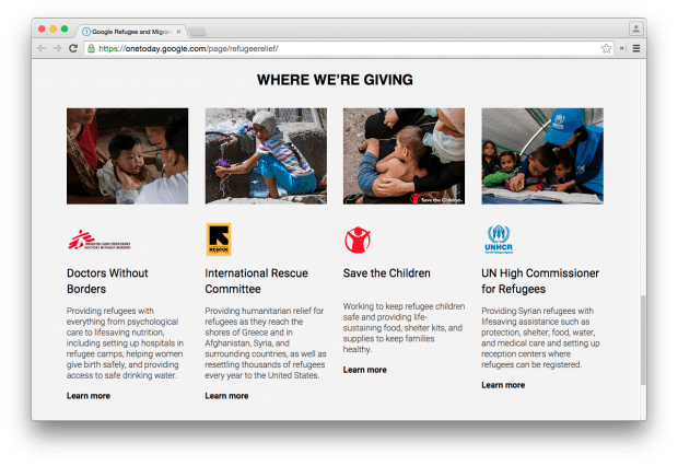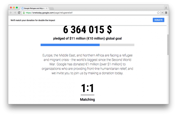 Для помощи беженцам в Европе компания Google пожертвует $5,5 млн, чтобы совместными усилиями собрать сумму в $11 млн, удваивая каждое пожертвование, сделанное через сайт Google Refugee and Migrant Crisis.