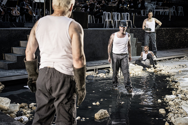 © Michael Kneffel / Ruhrtriennale Но не только такими силовыми методами расширенный состав оркестра MusicAeterna (пермяки плюс сочувствующие) становится едва ли не главным участником представления. Даже зрительно он на самом видном месте — на приподнятой сцене, между пролетарской лужей и буржуазной Валгаллой. Туда-сюда вверх-вниз то и дело перемещаются певцы. Курентзис в брутальных башмаках танцует за пультом в самом эпицентре событий, периодически затмевая своим по-барочному бурлящим оркестром все происходящее вокруг. Вагнер вывернут наизнанку. Подзвучка невероятного качества (да-да, нечего кривиться, без подзвучки там никак), позволяющая певцам появляться в любой точке Jahrhunderthalle, быть совсем вплотную к зрителю или на уровне многоэтажного дома, — это тоже «анти-Байройт», довольно фантастический, потому что тембр и индивидуальность звука остаются, а пространство как бы исчезает. Для вагнеровских пуристов все это, конечно, против шерсти, но вряд ли это они заполняют бохумский зал на семи представлениях «Золота Рейна», последним из которых Руртриеннале завершается 26 сентября.