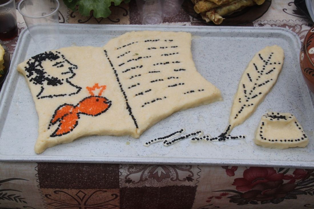 Черная икра использовалась также для создания пера, чернильницы и строчек в раскрытой книге. Золотую рыбку, изображенную рядом с портретом писателя, выложили красной икрой. Также в работе использовался тертый сыр.