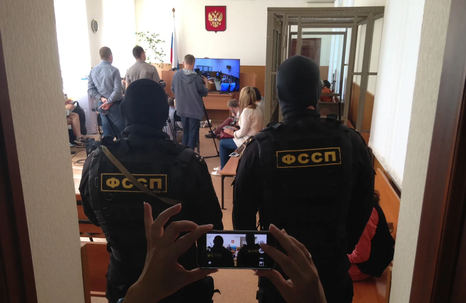 В здании суда несколько спецназовцев Федеральной службы судебных приставов. В бронежилетах, балаклавах, при оружии. Бешено озираются по сторонам. Один, как ковбой, завел руку за спину и постоянно держит ладонь на рукояти дубинки. Журналистов отправляют в зал, где организована видеотрансляция. На стене опись предметов, чтобы корреспонденты не вздумали унести «Герб 1 шт», «Стол для судей 700х650х910» или «Комплект флагов 1 отверстие».
