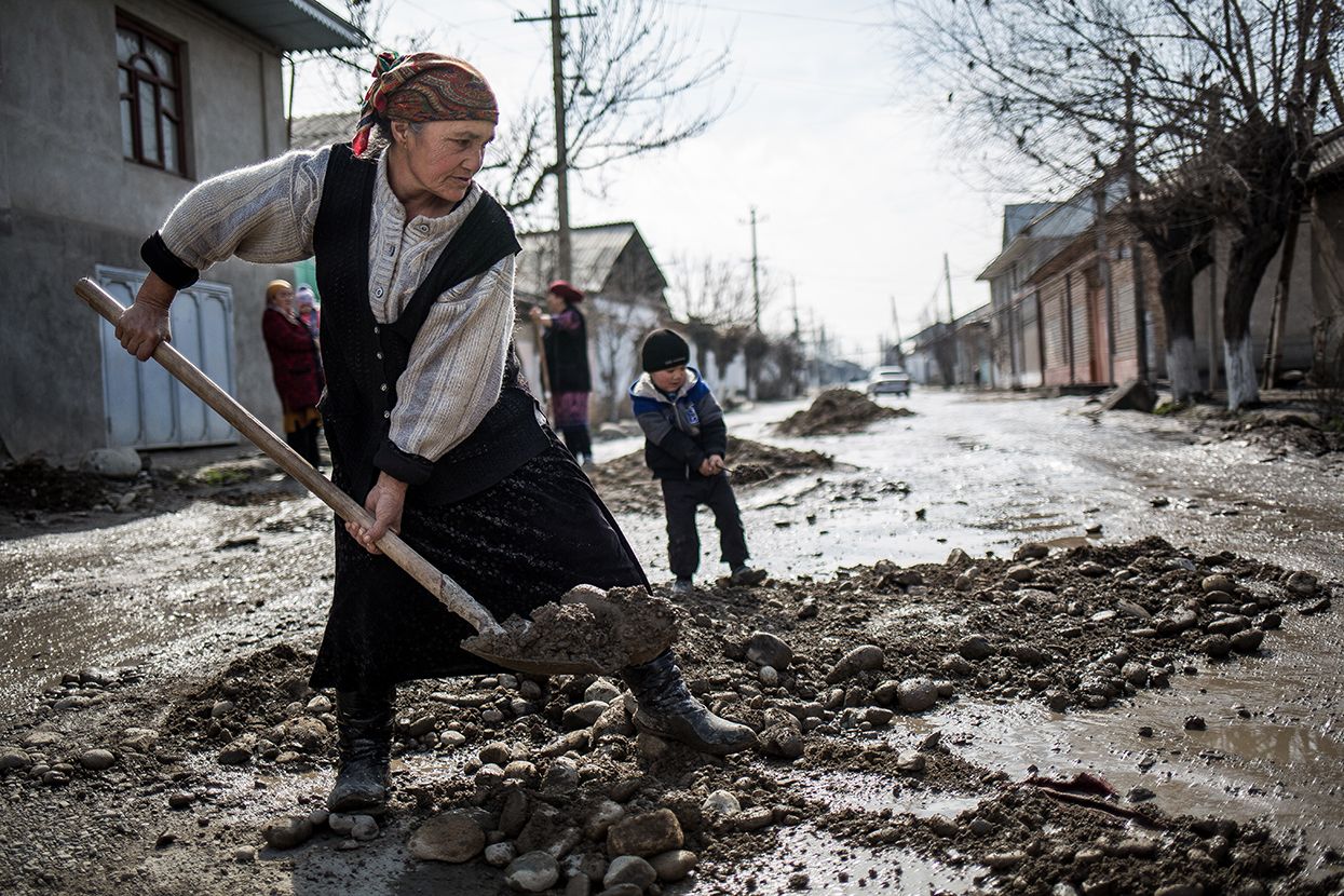 Женщина сгребает грязь на дороге возле своего дома. Город Ош, Ошская область