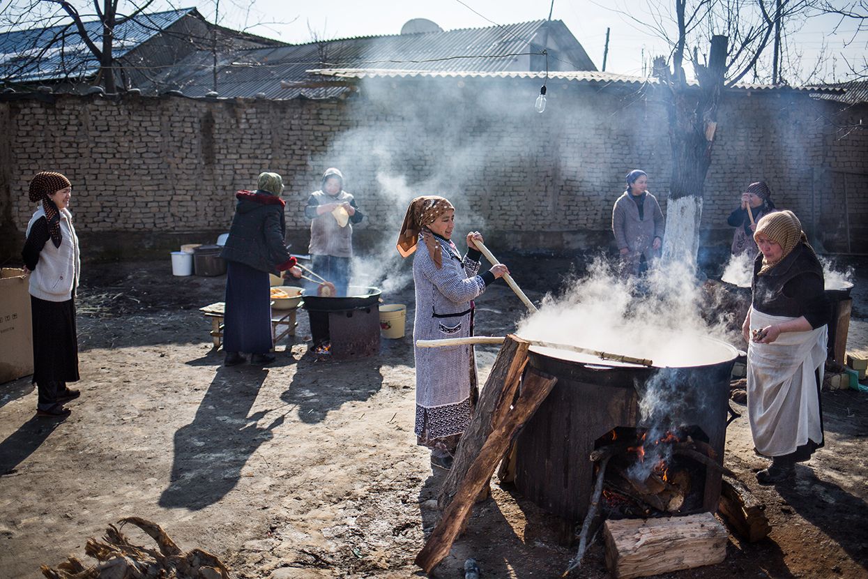 Женщины готовят сумаляк, традиционное весеннее блюдо. Ош, Ошская область