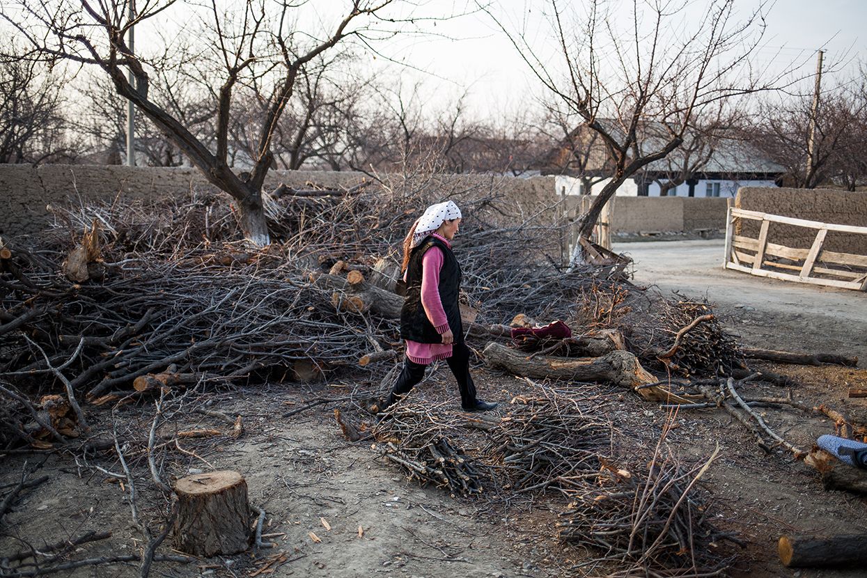 Женщина на фоне спиленных деревьев, которые зимой пойдут на дрова. Джаны-Джер, Баткенская область