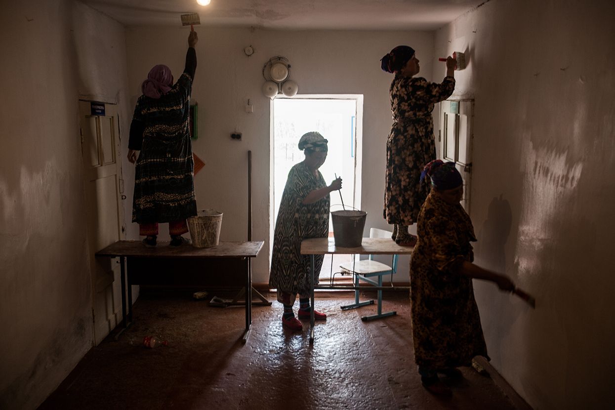 Женская бригада ремонтных рабочих в школе во время летних каникул. Исфана, Баткенская область