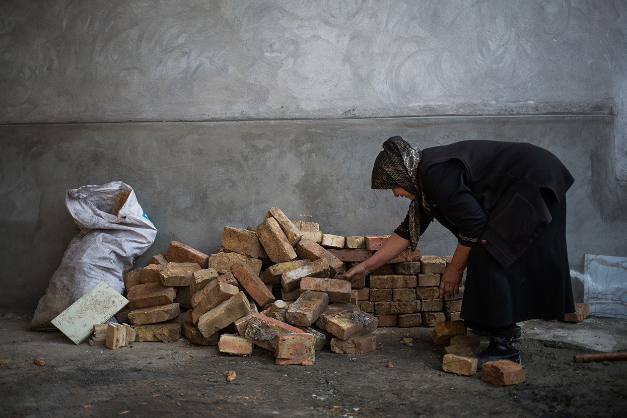 Махфират, 60 лет, собирает кирпичи для ремонта своего разрушенного дома. Ош, Ошская область