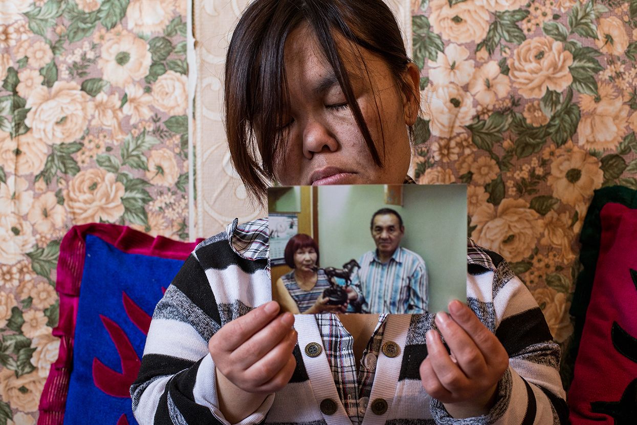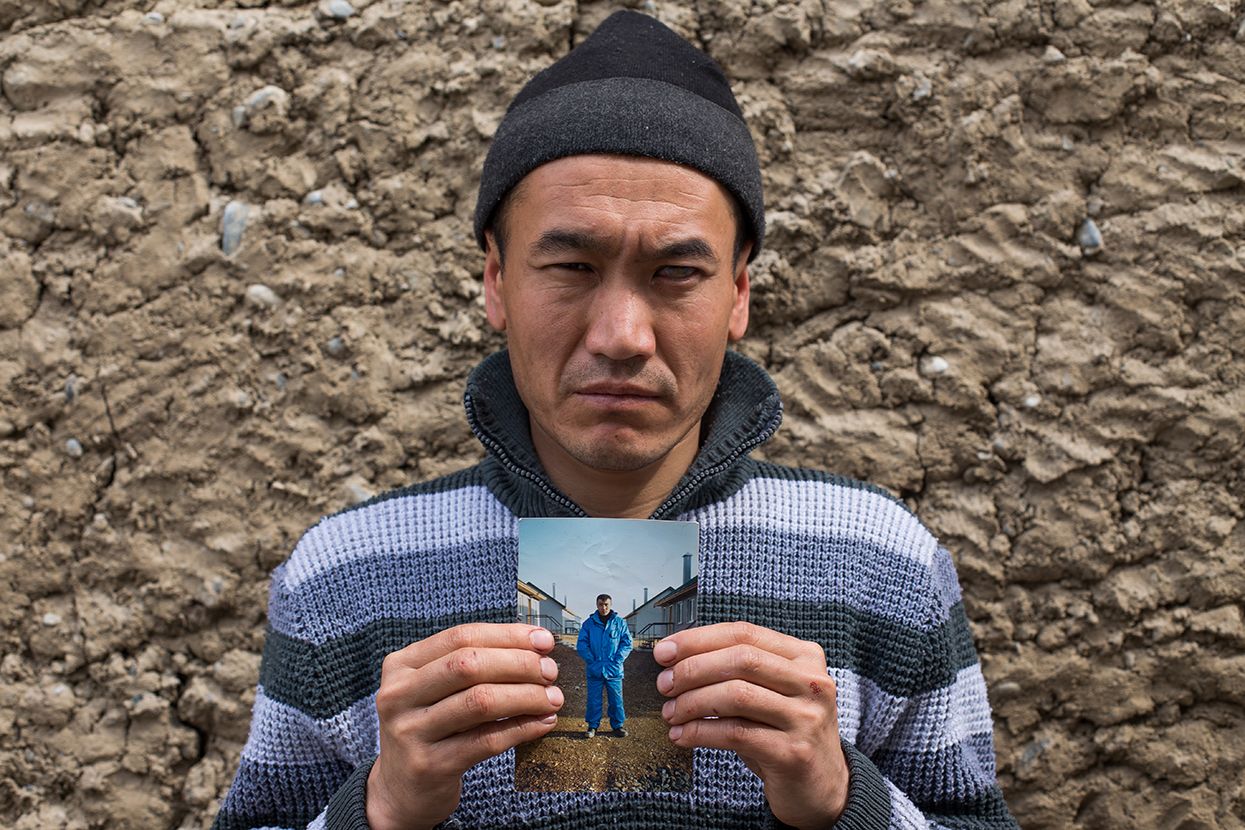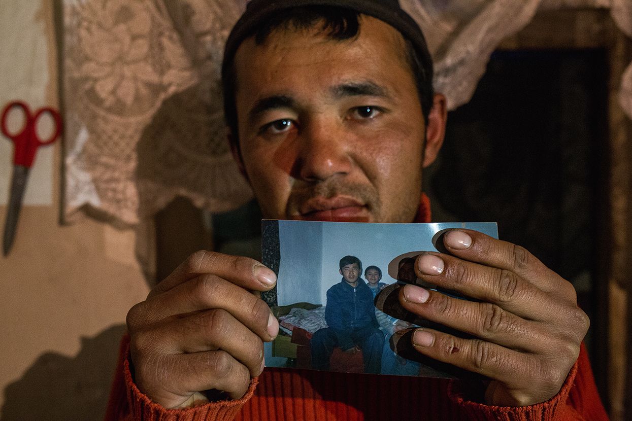 Асылбек, около 30 лет, держит портрет своего брата, который пропал в 2013 году после 13 лет жизни в России. Их мать умерла в 2013 году. Баткен, Баткенская область