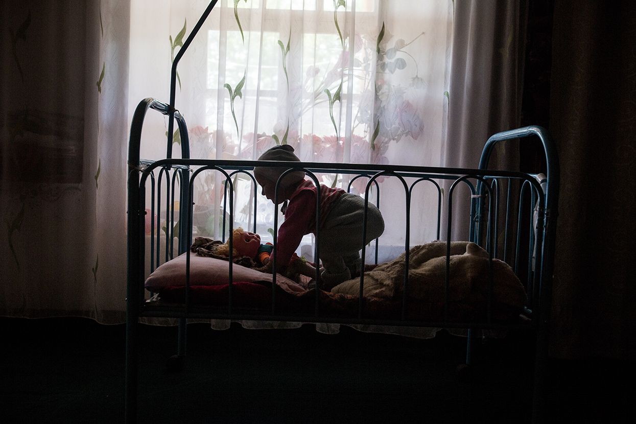 Годовалая девочка осталась без родителей — ее воспитывает бабушка. Она соорудила детскую кроватку, поставив около постели решетку. Карабаг, Баткенская область