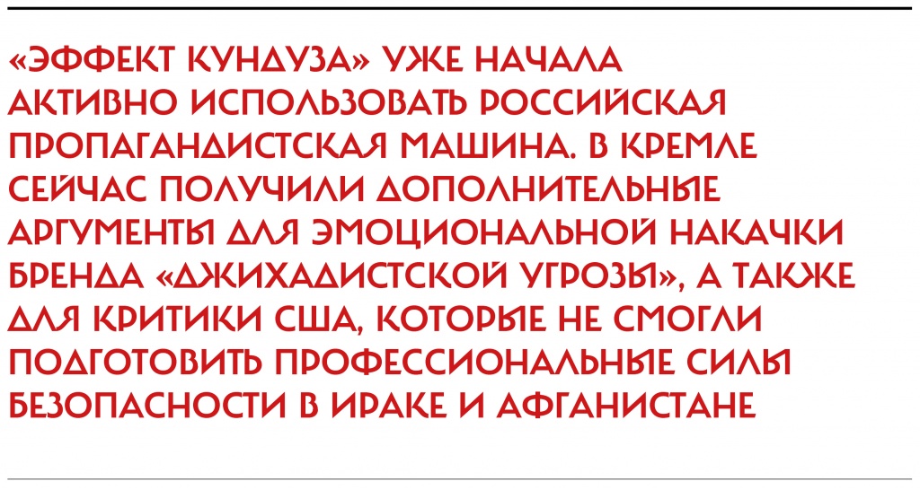 Драматичные события в Кундузе и соседних с ним северных провинциях страны еще не завершились. Боевые действия все еще идут. Отброшенные от Кундуза отряды талибов пытаются просочиться сквозь бреши в неэффективной системе местных органов безопасности, умело используя внезапность, а также неповоротливость кабульской бюрократической машины. В итоге в афганском и зарубежном общественном мнении сохраняется «эффект Кундуза» — система долгоиграющих и эмоционально ярких информационных поводов, формирующих образ «непобедимости» «Талибана» и безнадежной слабости официального Кабула, а заодно и его неэффективных западных союзников. Кстати, «эффект Кундуза» уже начала активно использовать российская пропагандистская машина. В Кремле сейчас получили дополнительные аргументы для эмоциональной накачки бренда «джихадистской угрозы» (что крайне важно в связи с военным проникновением Москвы в Сирию под предлогом борьбы с «Исламским государством»*), а также для критики США, которые не смогли подготовить профессиональные силы безопасности в Ираке и Афганистане.