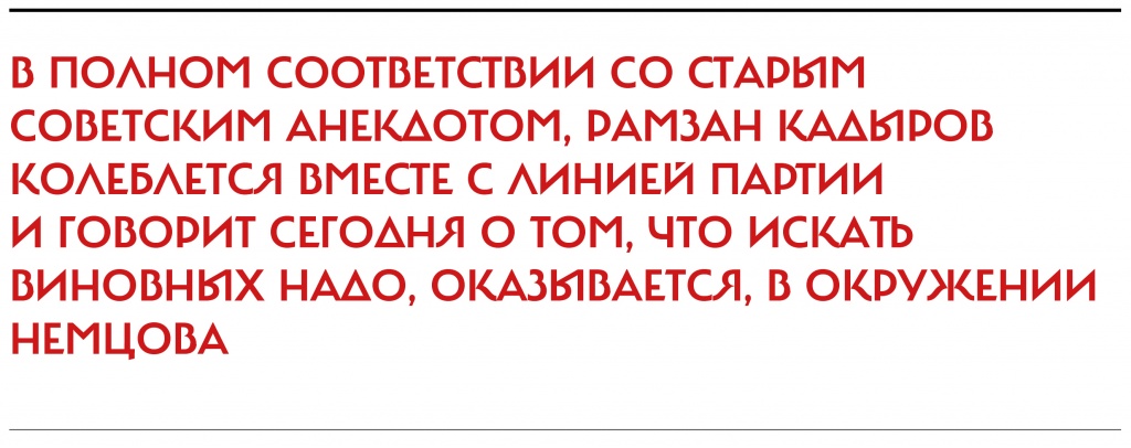 Интересно проследить за тем, как меняются версии преступления, выдвигаемые Рамзаном Кадыровым в зависимости от ситуации в стране и мире. Например, не далее чем в июне 2015 года Рамзан Кадыров публично намекал на то, что за убийством Бориса Немцова стоят украинские спецслужбы. Тогда это было модно: виновников всего и вся искали в Киеве, и, указав на украинское направление, можно было попытаться отвлечь внимание общественности от того, что следы-то на самом деле ведут в Чечню. Сейчас международная ситуация изменилась, власть не знает, что ей делать с Донбассом, и, переключившись на Сирию, пытается при этом налаживать отношения с Западом. Меняется и риторика Рамзана Кадырова. В полном соответствии со старым советским анекдотом, Кадыров колеблется вместе с линией партии и говорит сегодня о том, что искать виновных надо, оказывается, уже не на Украине, а в окружении Немцова. Во как!