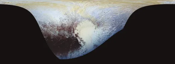 Новые фотографии демонстрируют разнообразие ландшафтов на карликовой планете и доказывают, что Плутон нельзя считать мертвым объектом, на котором не происходит никаких изменений. Цветные изображения получаются путем комбинации снимков в синих, красных лучах, а также данных по инфракрасному излучению от мультиспектральной камеры «Ральф» (Ralph). Поверхность Плутона окрашена в пастельные тона — начиная от бледно-голубых, желтых и оранжевых оттенков и заканчивая бордовыми «заливками». Многие детали рельефа окрашены в свои собственные индивидуальные цвета, что позволяет проследить сложную геологическую и климатологическую историю «властелина подземного мира». На цветных снимках различимы детали величиной 1,3 км.