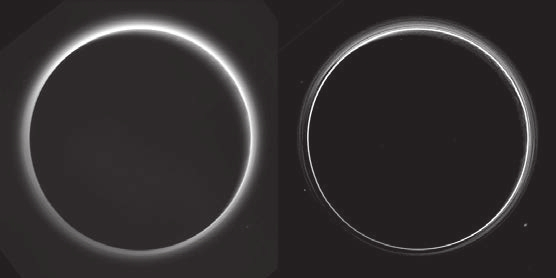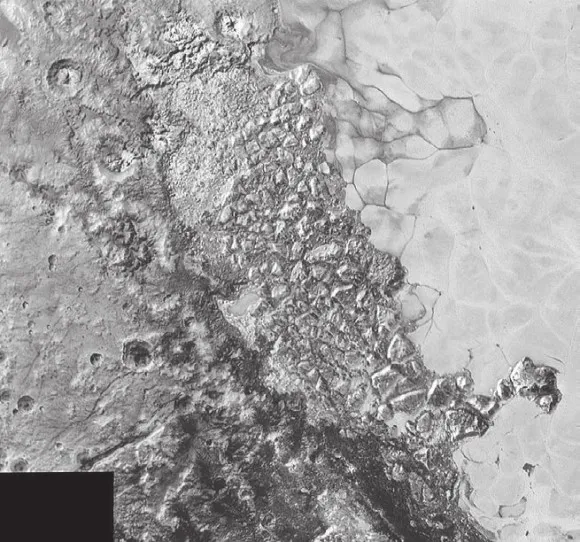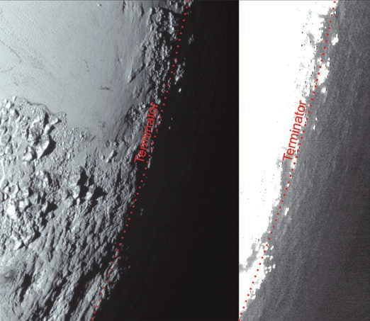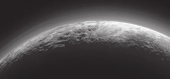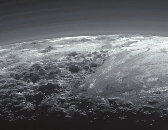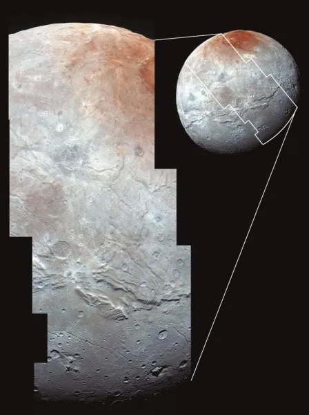 1. Такой вид Плутон имел бы с высоты 1800 км над экватором, если смотреть на его северо-восточную часть. Темный участок внизу с кратерами неофициально назван пока областью Ктулху (Cthulhu Regio), а яркая ледяная гладь вверху — равниной Спутника (Sputnik Planum) — в честь первого советского спутника. Всё фото в ширину занимает 1800 км. Снимки были сделаны во время пролета 14 июля 2015 года с расстояния 80 тыс. км.2. В центре этого фото шириной 470 км — крайне пересеченная местность на северо-западной окраине обширной ледяной равнины Спутника. Самые мелкие детали — размером 0,8 км.3. Этот 350-километровый вид Плутона от New Horizons демонстрирует невероятное разнообразие поверхностных коэффициентов отражения и геологических форм рельефа на карликовой планете. Изображение включает в себя как темные древние сильно кратеризованные участки, так и яркие гладкие геологически молодые вкрапления, а также горные массивы и загадочные темные округлые холмы, напоминающие земные дюны. Их происхождение остается предметом дискуссий. Разумеется, при нынешней почти эфемерной атмосфере привычные нам дюны образоваться не могут, но Плутон мог обладать более-менее плотной атмосферой в прошлом, либо за появление «дюн» ответственны какие-то иные, неведомые нам процессы. Мельчайшие видимые здесь объекты — размером 0,8 км.4. Это самое качественное изображение крупнейшего спутника Плутона Харона. Харон (его диаметр — 1200 км, что вдвое меньше самого Плутона) раскрывает удивительно сложную геологическую историю, в том числе тектонические разломы, относительно гладкие равнины, царапины, пока неясные особенности рельефа в правой части и в значительной степени кратеризованные регионы в центре и верхней левой части диска. Наличествуют также замысловатые узоры на отражающей поверхности Харона, в том числе яркие и темные лучи, расходящиеся от кратеров, и таинственное красноватое пятно Мордор (Mordor Macula) в приполярной области в верхней части снимка. Наименьшие видимые объекты достигают 0,8 км в поперечнике.5. Это изображение Плутона от New Horizons, обработанное двумя разными способами, демонстрирует удивительное для столь безжизненного небесного тела явление — сумрак, порождаемый мягким свечением атмосферной дымки, что освещает поверхность между закатом и восходом солнца и позволяет чувствительным камерам New Horizons разглядеть детали рельефа в ночных регионах, которые иначе остались бы для нас незримыми. Правая версия изображения значительно «засвечена», чтобы выявились малозаметные топографические детали за чертой терминатора (линии, разделяющей день и ночь). Снимок сделан 14 июля 2015 года с расстояния 80 тыс. км.6. Изображения атмосферной дымки вокруг Плутона, полученные с обратной его стороны спустя почти 16 часов после сближения — с расстояния 770 тыс. км при фазовом угле 166°. Север Плутона находится сверху, и солнце освещает карликовую планету с правого верхнего угла. Снимки гораздо выше по качеству, чем выпущенные вскоре после 14 июля, что позволяет разглядеть новые детали. Нужно отметить, что левый вариант подвергался лишь незначительной обработке, в то время как правая версия специально обработана так, чтобы выявить большое количество дискретных слоев атмосферной дымки. В левой версии в правом верхнем углу диска Плутона на узком залитом солнцем серпе сквозь дымку можно разглядеть некото