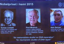 Лауреатами Нобелевской премии по химии в 2015 году стали Томас Линдал, Пол Модрич и Азиз Санкар за исследование механизмов восстановления ДНК. Об этом говорится в пресс-релизе Нобелевского комитета.
