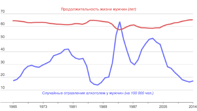 Нет, дело не в этом. В начале 1980-х в стране была большая группа сильно пьющих людей. Они вошли в антиалкогольную кампанию и умерли только после ее конца. Из-за этого начались колебания. Понимаете, пока шла антиалкогольная кампания, новые сильно пьющие люди не появлялись, а после антиалкогольной кампании они начали появляться, началась эдакая пульсация уровня смертности. Потом началась совершенно фантастическая вещь: с 1994-го по 1998-й продолжительность жизни вдруг начала резко расти — Минздрав не мог понять, что происходит. В 98-м новый подъем смертности, он продолжался до 2003 года. Но с 2004 года началось новое снижение смертности. При этом никаких правительственных мер не было, так что это были именно естественные колебания, запущенные антиалкогольной кампанией. А вот дальше, видимо, вмешалось правительство, потому что в 2006 году были приняты некоторые законы, которые все-таки несколько затруднили доступ алкогольных суррогатов на рынок. Появилось Росалкогольрегулирование, выросли цены на водку. С этого времени продолжительность жизни мужчин росла. В 2014 году смертность от алкогольных отравлений вновь немножко выросла. Человек — сложная система, поддерживать нулевую ситуацию очень сложно.