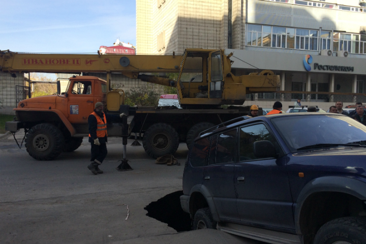 Дорожное полотно провалилось в центре Новосибирска. Под землю ушел джип Toyota, рядом находятся другие автомобили.