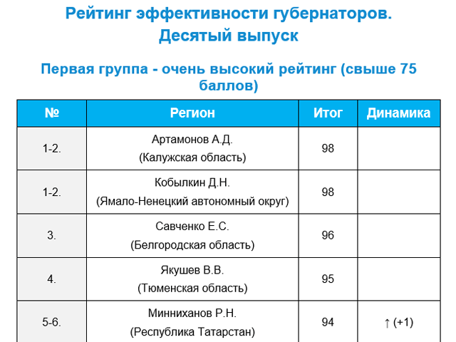 В тройке лидеров также остался с результатом в 96 баллов губернатор Белгородской области Евгений Савченко. На четвертой позиции с результатом в 95 баллов находится губернатор Тюменской области Владимир Якушев. Пятое и шестое места (94 балла) разделили между собой глава Татарстана Рустам Минниханов и губернатор Кемеровской области Аман Тулеев.