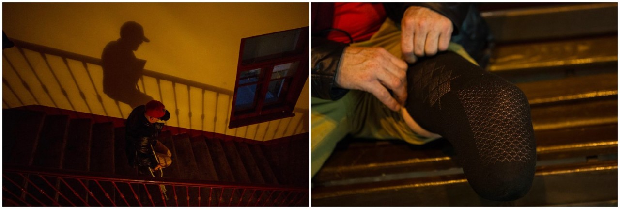 Слева: Владимир спускается с третьего этажа, где находится хостел. Справа: Владимир надевает носок на культю.Фото: Алексей Лощилов для ТД Я спрашиваю Веселкина, когда он собирается бросить пить, ведь Бог давно уже подает ему знаки, что хватит. «Будет 60 — и брошу. 30 лет не пил и 30 лет пил. Осталось недолго, — в следующем году мне исполнится 55, — недолго думая, говорит Веселкин. — А может, и раньше брошу. Я категорически против навязывания здорового образа жизни. Я за тот образ жизни, который люди хотят вести. И за то, чтобы нести за это ответственность».