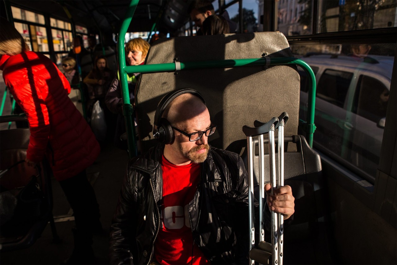 Владимир едет в автобусе по Невскому проспекту.Фото: Алексей Лощилов для ТД Одной операцией дело не ограничилось. «Я жил в аду. Физическом. В постоянном состоянии боли, —вспоминает Веселкин. — Четыре больницы. Одни врачи исправляли ошибки других врачей. Но, чтобы не сломаться окончательно, иногда давал концерты — в Туле, в Челябинске. В Питер приезжал, даже записи делал. Принимал участие в каких-то проектах, но тем не менее понимал, что еще чуть-чуть, и я просто свихнусь. Потому что я отказывался принимать обезболивающие. Я, как каждый русский человек, предпочитал глушить боль алкоголем».