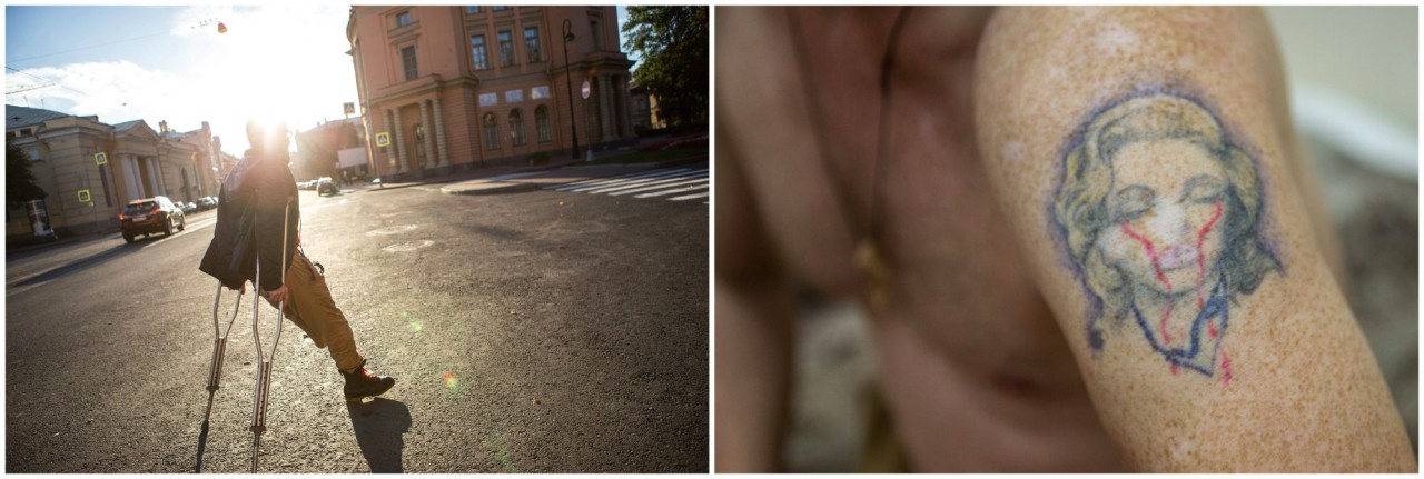 На Садовой улице. На плече Владимира — тату Мерлин Монро. Ее нос прижжен сигаретой.Фото: Алексей Лощилов для ТД Через защищенную кодовым замком дверь мы проскальзываем во двор-колодец в Кузнечном переулке. Прежде чем набрать код у бурой подъездной двери, Владимир Веселкин, повернувшись ко мне, становится на костылях как на котурнах, выгибает спину и произносит еще один монолог: «Смотря в детстве свой любимый фильм «Парижские тайны» с Жаном Маре, я никогда не думал, что повторю эту сказочную историю. Буду жить на самом дне, а когда надо, буду возвращаться в свет, снова становиться звездой. Князем тьмы!»