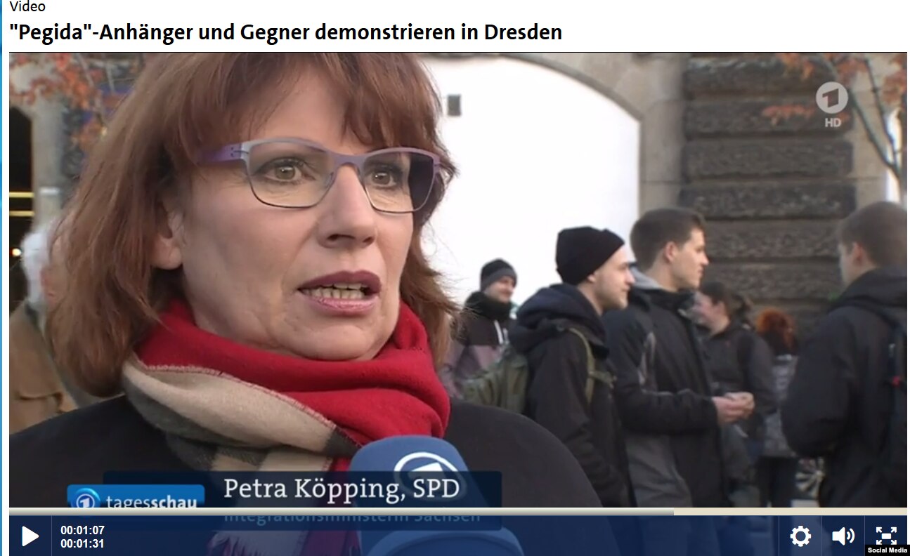 В Дрездене прошла демонстрация выступающего против "исламизации Европы" движения ПЕГИДА, приуроченная к первой годовщине появления этой организации. Хотя ПЕГИДА – это аббревиатура, слово уже стало в Германии нарицательным. Число вышедших на улицы и на площадь перед оперой сторонников ПЕГИДА превышало 20 тысяч человек, не менее 13 тысяч участников собрала и демонстрация противников ПЕГИДА. Говорит участвовавшая в демонстрации против ПЕГИДА министр по делам интеграции правительства Саксонии, представитель партии социал-демократов Петра Кёппинг: