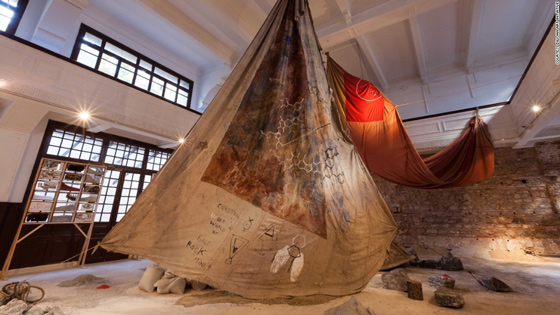 © CNN Майкл Раковиц, «Плоть ваша — кости наши», 2015. Здание греческой младшей школы в Галате Осмысление кабинета как пространства приватного, даже интимного, но одновременно и как места создания идей, влияющих на мир в целом, присутствует в проекте Кристин Тейлор Паттен «микро/макро: 2001 рисунок» — серии крошечных, со спичечный коробок, абстракций, каждая из которых обозначает один год в двухтысячелетней истории планеты Земля. Иначе эта тема развита в инсталляции «Торговцы солью» Анны Богигян. В просторном и светлом зале со сценой находятся фрагменты потерпевшего крушение корабля — куски деревянного корпуса, подвешенные под потолком паруса с начертанными на них картами и формулами, горы соли. Впечатляющая своей монументальностью работа наталкивает на вопрос, который ранее ставил Ролан Барт в эссе «Наутилус и пьяный корабль» применительно к романам Жюля Верна: что означает корабль в произведении, в нашем случае — в инсталляции Богигян? Символ ли это странствий и перемещений, а следовательно, и всевозможных изменений и поисков либо перед нами очередной «жест самозамыкания» — закрытое изолированное пространство, внутри которого можно «отгородиться и обжиться», пространство «энциклопедического труда» и эскапизма? Так или иначе, в инсталляции Богигян его возможная закрытость преодолевается — через деконструкцию объекта.