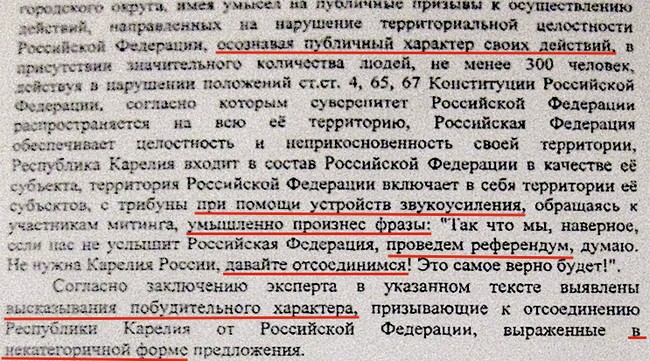 Месяц спустя ФСБ завела дело. Как утверждается в обвинительном заключении, эксперт установил, что в финальных фразах речи Заваркина присутствуют "высказывания побудительного характера, призывающие к отсоединению Республики Карелия от Российской Федерации, выраженные в некатегоричной форме предложения".
