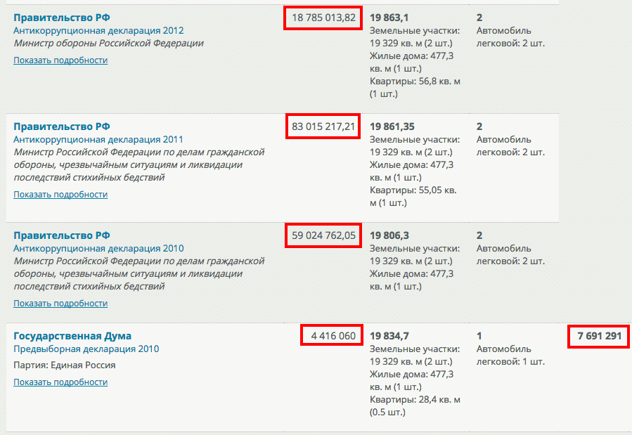 С 2010 по 2012 год бюджет семьи Шойгу составил 173 млн. рублей (включая 7.691.291 руб. на счетах на начало периода, остальное — доходы).