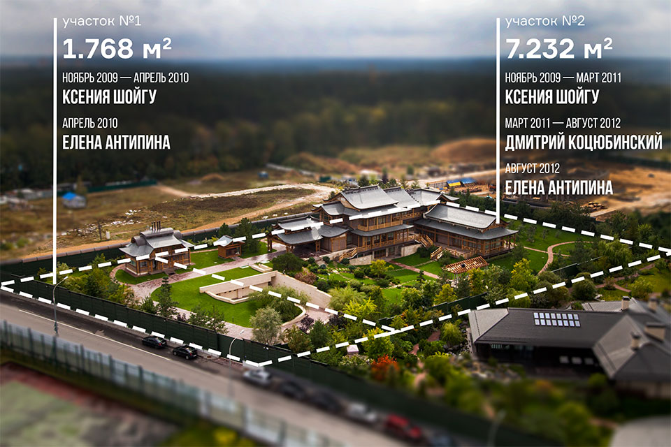 Владелица земли, выяснили ФБК, уроженка города Ачинск Красноярского края. Исторические выписки показали, что в ноябре 2009 года эту землю в Барвихе купила студентка Ксения Сергеевна Шойгу — дочь Сергея Шойгу, тогдашнего главы МЧС и члена высшего совета «Единой России». Ксении тогда только исполнилось 18 лет и необходимость указывать её в отцовской декларации отпала. Ксения Шойгу стала владелицей земли минимальной стоимостью $100 тыс. за сотку или $9 млн за весь участок.