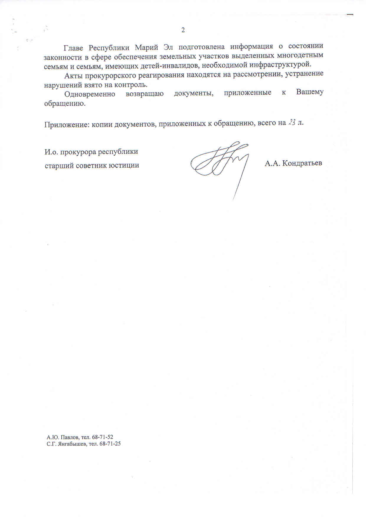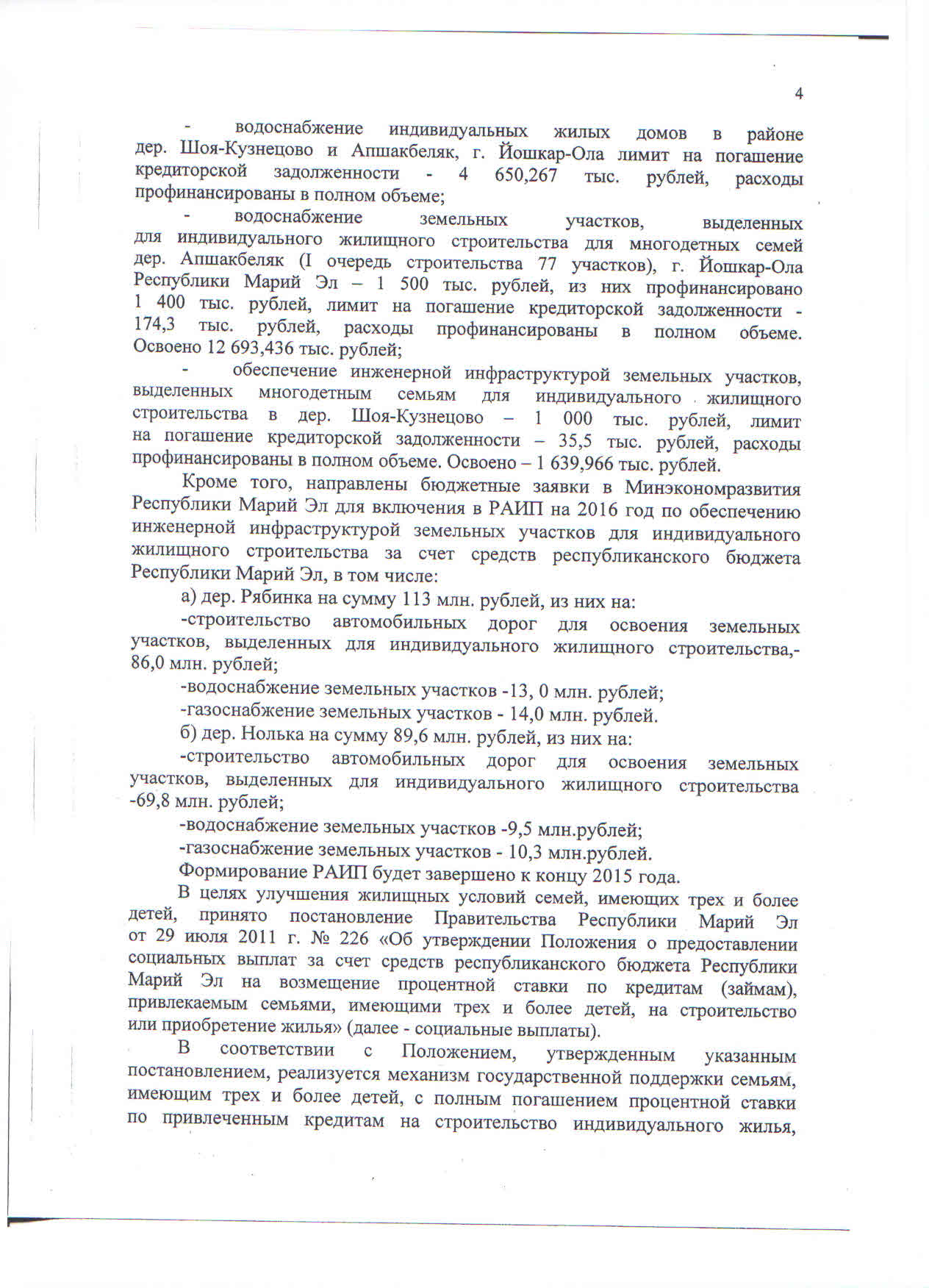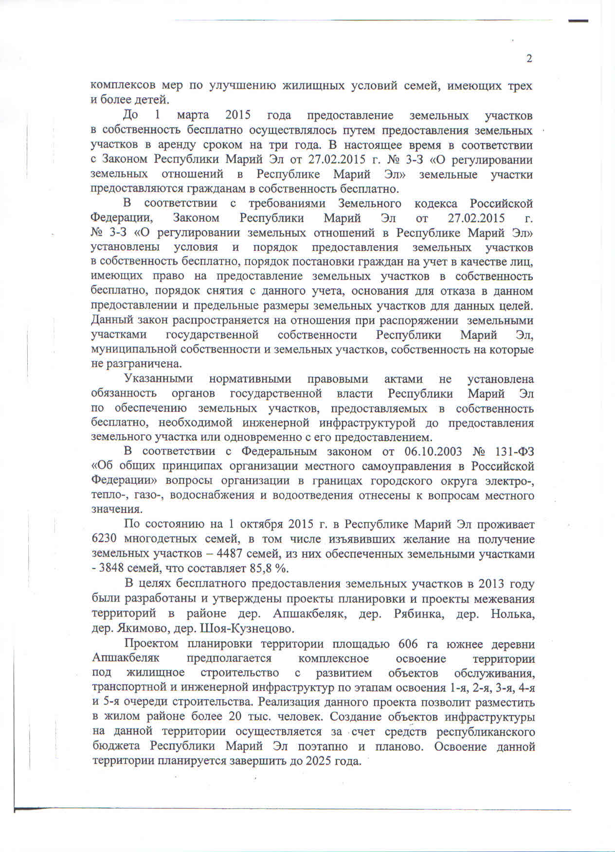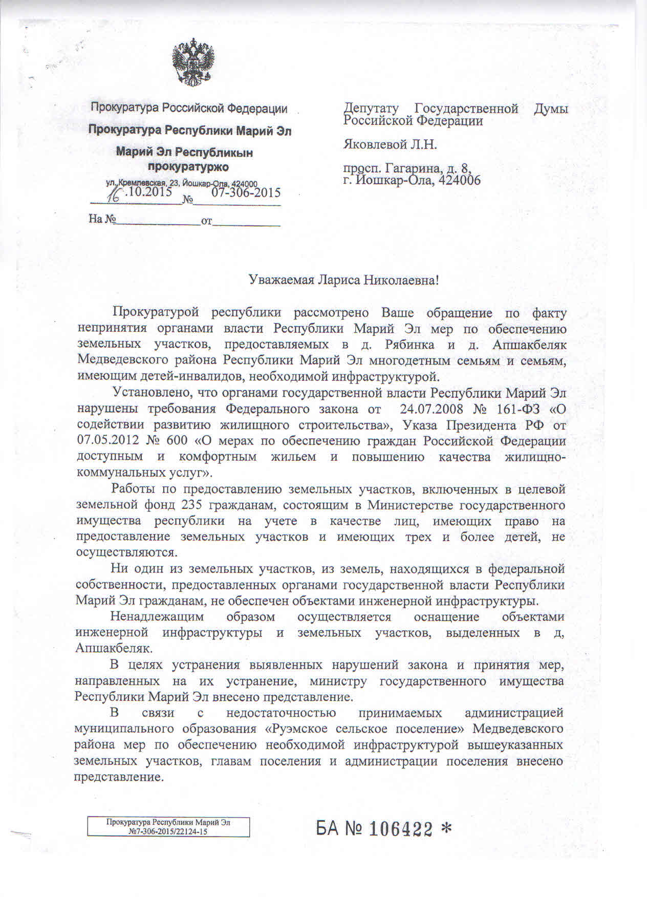 - Главе Республики Марий Эл подготовлена информация о состоянии законности в сфере обеспечения земельных участков, выделенных многодетным семьям и семьям, имеющих детей инвалидов, необходимой инфраструктурой.
