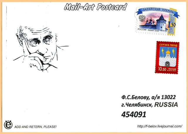 Это уже не первое мэйл-арт-послание от Фёдора Белова, любителя односторонних почтовых карточек из Челябинска. В прошлый раз, если не изменяет память, карточкой с портретом Путина он поздравил меня с Новым годом. До недавнего времени, виднеясь из-за рамы картины Вадима Ряховского на кухне, эта карточка ненавязчиво напоминала о том, что надо бы ответить Фёдору. Но мне так и не удалось вдохновиться и выкроить время, чтобы порадовать его мэйл-артом. К моему большому стыду...