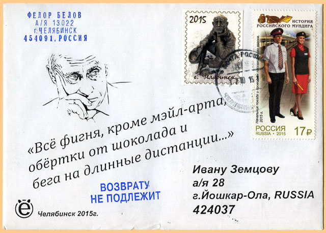 На конверте не без удовольствия прочитал высказывание (Путина?), с которым абсолютно согласен и которое гласит, что "всё фигня, кроме мэйл-арта, обёртки от шоколада и бега на длинные дистанции".