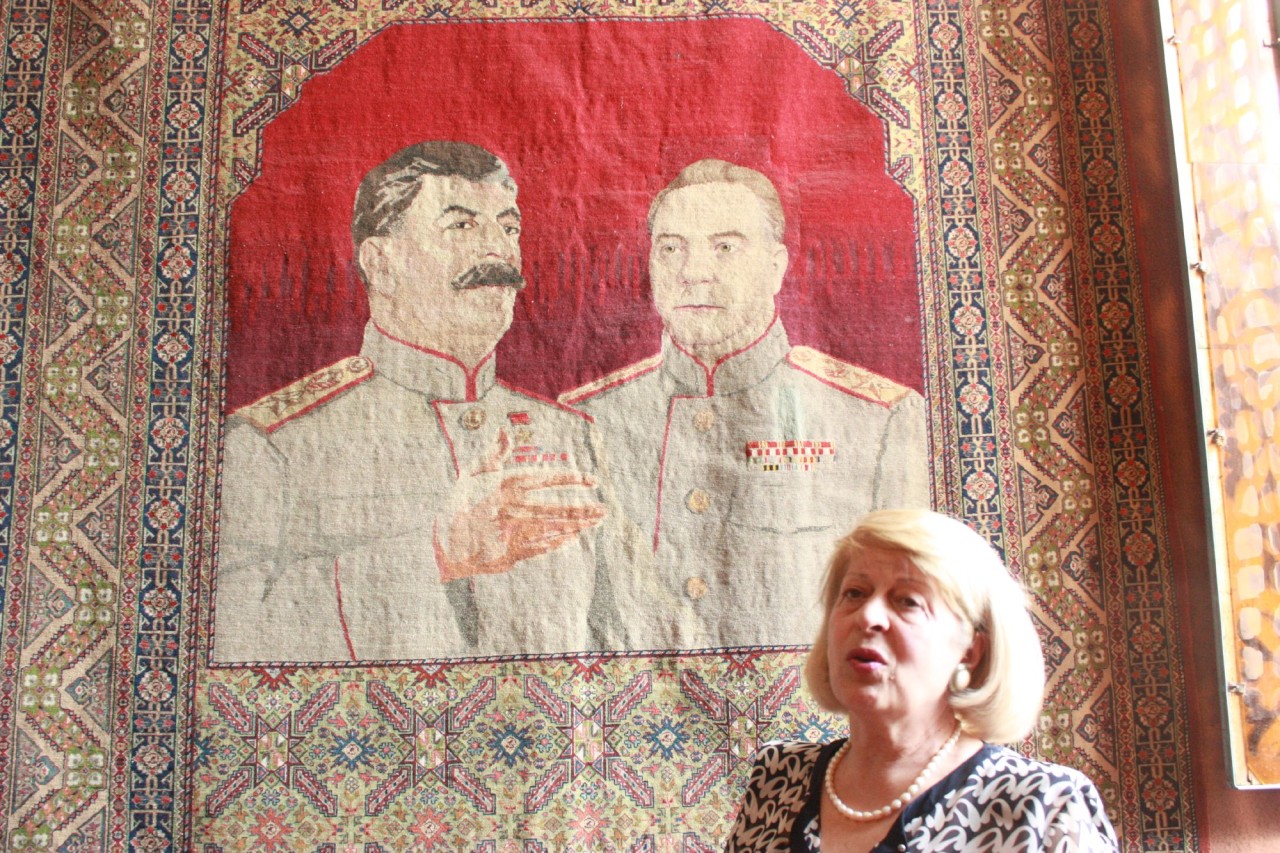 Музей Сталина в ГориФото: Дмитрий Окрест Но именно она предложила в начале нулевых обустроить под лестницей зал репрессий — после зала с пышным убранством, где на стеллажах стоят домотканые ковры в память Сталину, экскурсия спускается в тесное подземелье. «Погружаясь в документы, сравниваешь со своим сегодняшним опытом и понимаешь — никакое правительство без репрессий не правит, любое государство держится на насилии», — объясняет она. В подземелье на фоне советского флага стоит массивный стол, за каким восседали «тройки», на стенах висят списки расстрелянных в Грузии и письма заключенных из лагерей.