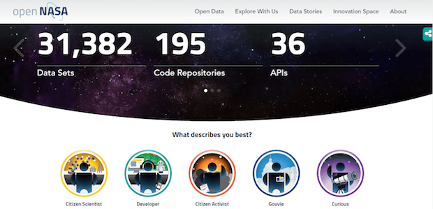 С 1958 года НАСА (NASA) занимается исследованием воздушно-космического пространства. Идея агентства – «Достижение новых высот и выявление неизвестного для пользы человечеству». Проект Open.NASA – открытая инновационная программа Управления по информационным технологиям и отдела инноваций (Chief Information Officer’s Technology and Innovation Division).