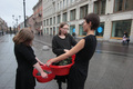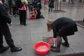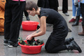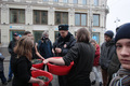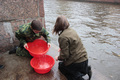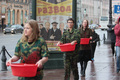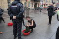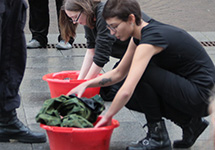 Активистки, одетые в забрызганный кровью камуфляж без опознавательных знаков, принесли воду из реки Мойки, сняли с себя камуфляж и принялись его стирать. Затем мокрую одежду развесили на ограждении Невского проспекта.