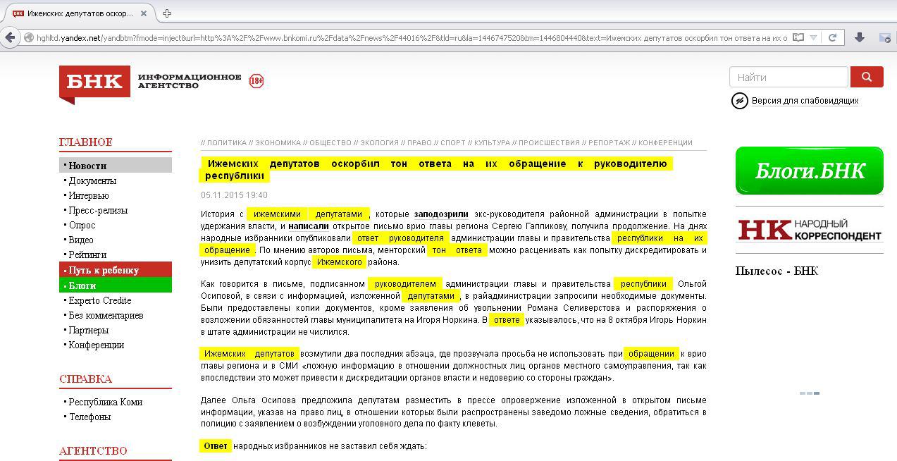 Вчера вечером на сайте информационного агентства появилась новость, касающаяся переписки ижемских депутатов с управлением администрации главы Республики Коми.