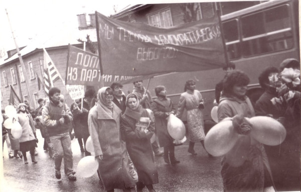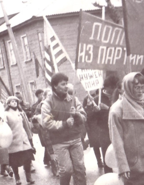 Утром, когда мы становились в колонны, чтобы пойти на Юбилейную площадь, мы приволокли все свои плакаты, которые должны были пришивать к машине, приволокли сложную конструкцию из двух флагов и пошли в нашей колонне. Меня обильно перемазали черной гуашью. Один из свидетелей нашей прохода по площади тогда пошутил, что было весело смотреть на негра с черной рожей и с белой шеей.