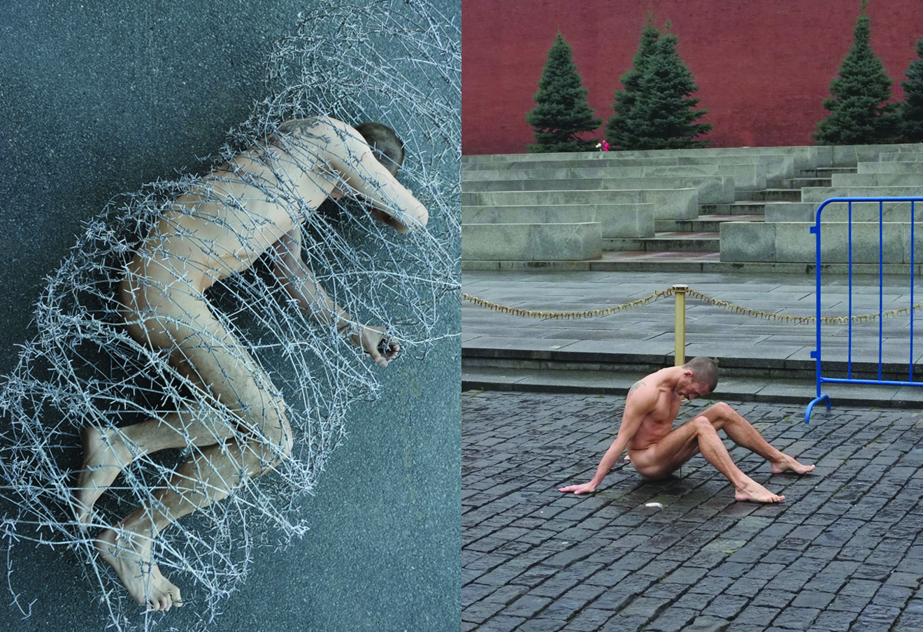 Петр Павленский во время акции «Туша» на Исаакиевской площади перед зданием Законодательного собрания и акции «Фиксация» на красной площади. Фото: Сергей Ермохин / ТАСC