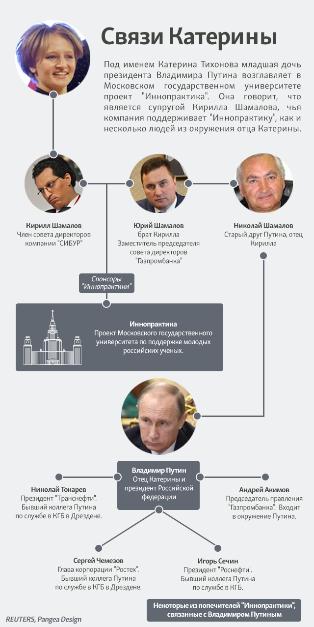Старшая дочь Путина, Мария, тоже связана с Московским университетом. Она – выпускница факультета фундаментальной медицины МГУ, специалист в области эндокринологии. Обе дочери Путина и Кирилл Шамалов отказались предоставить Reuters какие-либо комментарии. Представитель Геннадия Тимченко также не согласился ответить на вопрос о вилле в Биаррице, заявив, что "не готов комментировать вопросы личного характера".