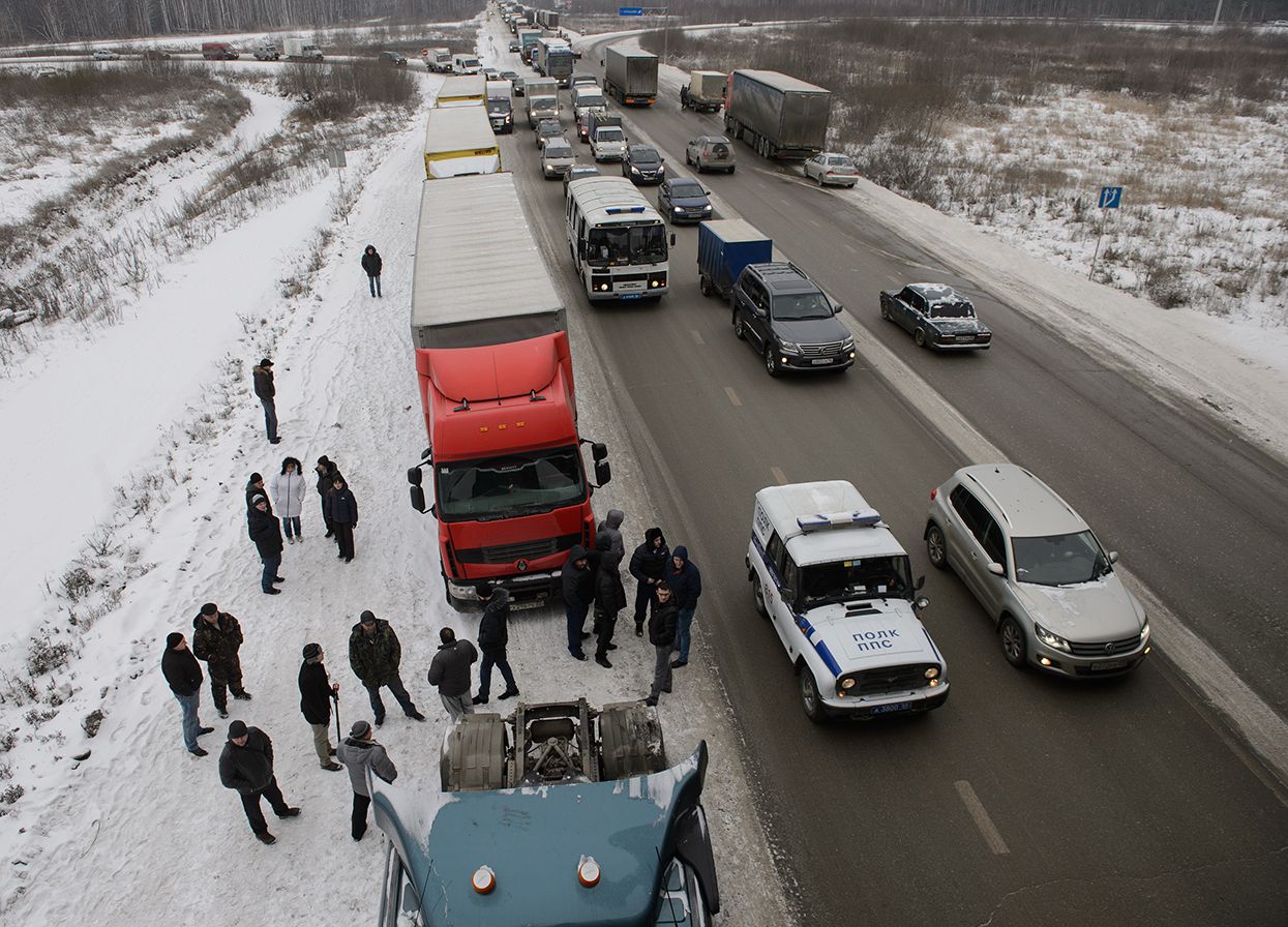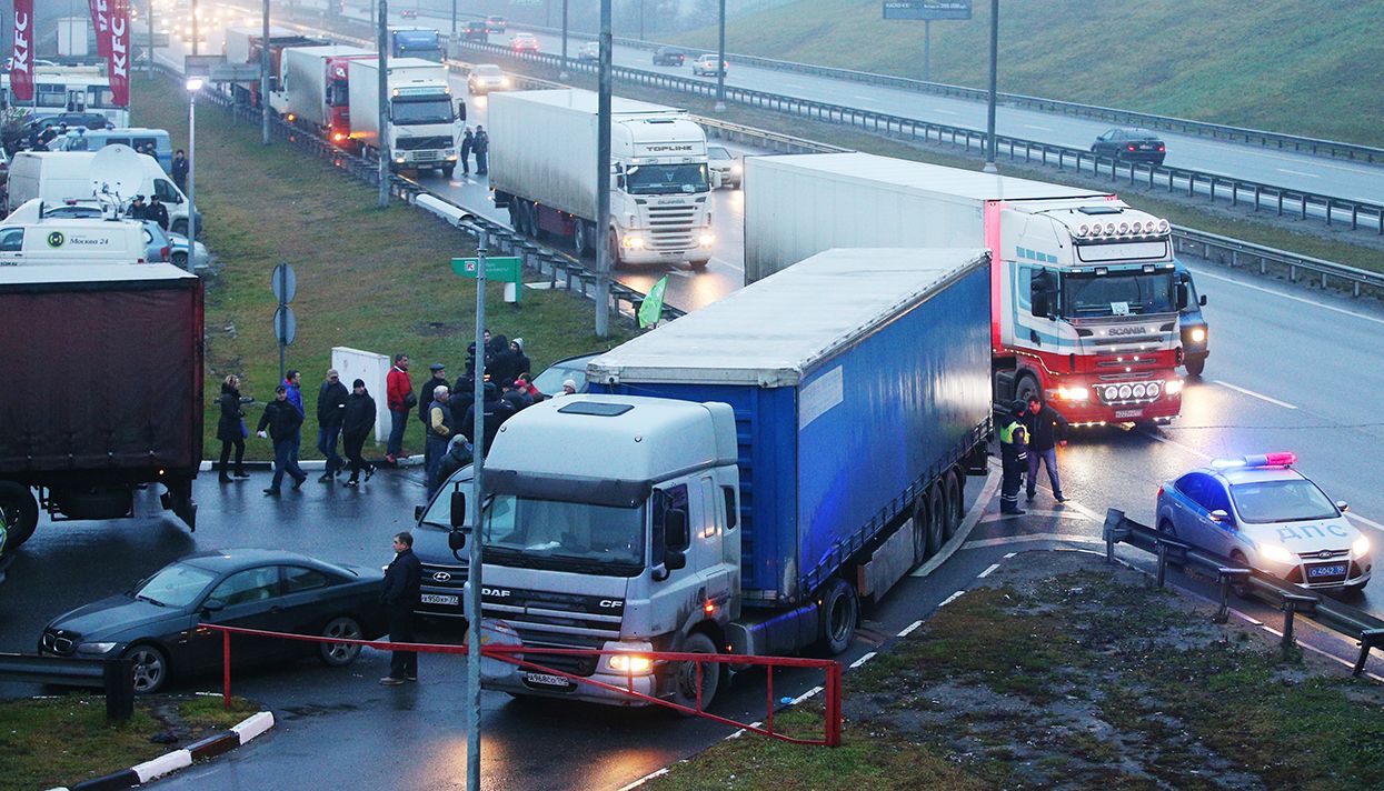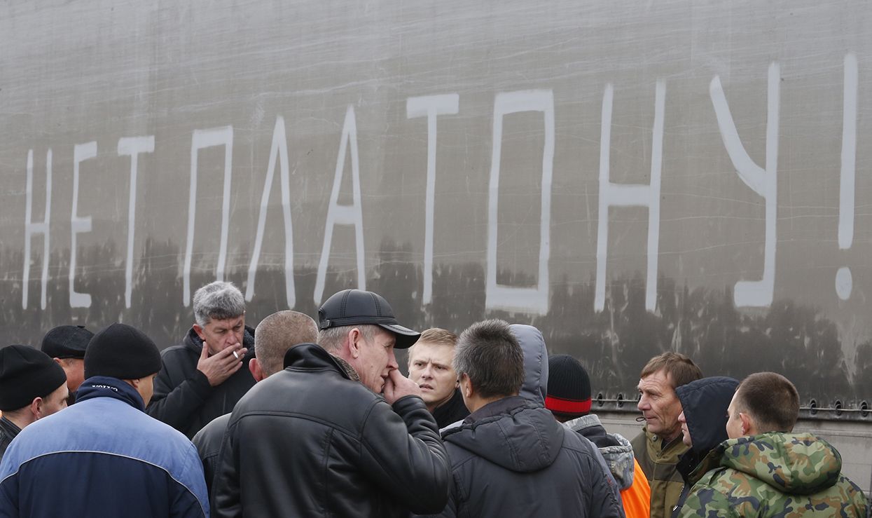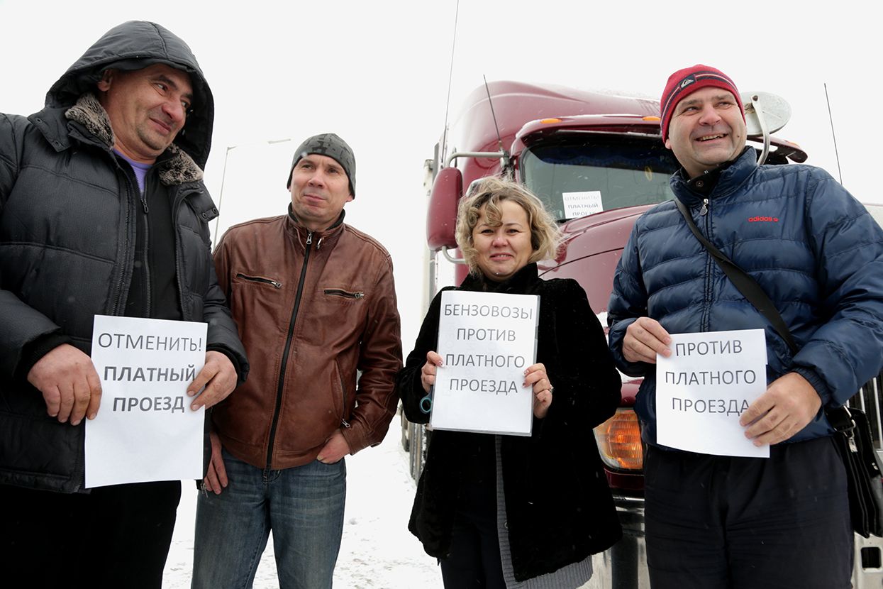 С 15 ноября в России начнет действовать новый сбор: все грузовики массой свыше 12 тонн должны будут платить за проезд по федеральным трассам по 1,53 рубля за километр. С марта сумма вырастет до 3,06 рубля за километр. Это означает, что доставка грузов резко подорожает, а у водителей-дальнобойщиков появятся новые обязанности: в случае неоплаты проезда им грозит штраф в 450 тысяч рублей за первое нарушение и в миллион рублей — за повторное. 11 ноября водители провели «тихие» (в большинстве случаев фуры просто были припаркованы на обочине и не мешали движению) акции протеста и уже добились первых результатов: правительство пообещало не штрафовать их за нарушение закона до мая (во всех регионах, кроме Московской области).
