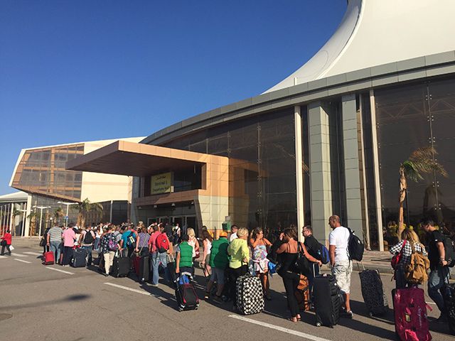 В соседнем терминале очередь растянулась на несколько десятков метров. Все в ней — российские туристы; автобусы подъезжают к зданию раз в 10-15 минут. Гиды туристических компаний инструктируют пассажиров: как выйдете из автобуса, сразу берите листок и пишите имя, фамилию, номер рейса, домашний адрес, номер телефона — и приклеивайте к багажу (его доставляют в Россию отдельно — грузовыми самолетами).