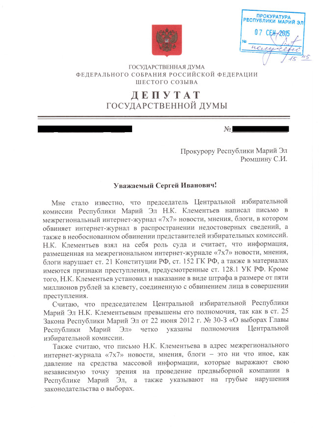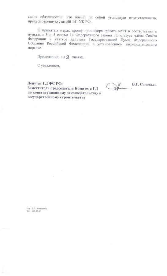Заместитель председателя Комитета Государственной Думы по конституционному законодательству и государственному строительству Вадим Соловьев направил официальный запрос Генеральному прокурору России Юрию Чайке о противоправной деятельности председателя ЦИК Марий Эл Николая Клементьева.