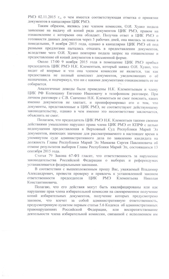 Действия председателя ЦИК Марий Эл могут быть квалифицированы как нарушение прав члена избирательной комиссии на своевременное получение копий избирательных документов, получение которых предусмотрено законов, что влечет за собой административную ответственность.