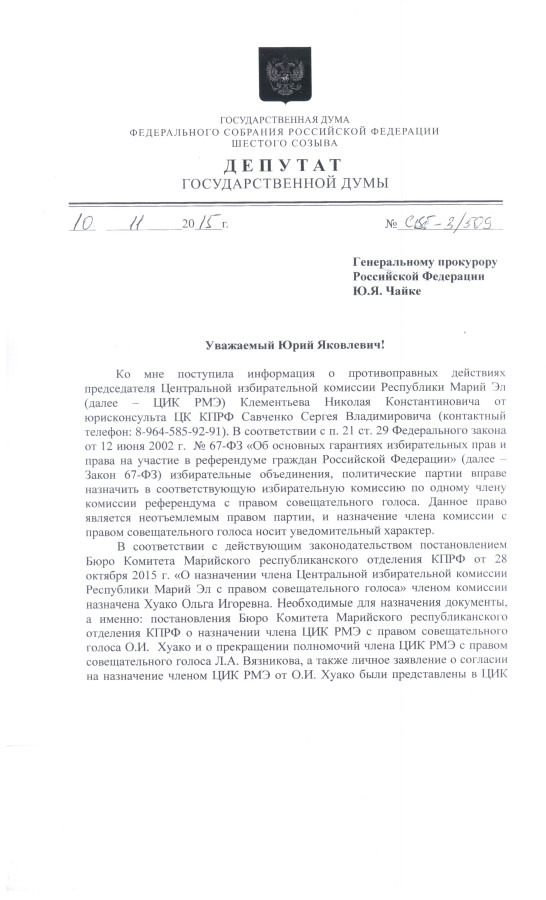 Зампред комитета Госдумы по конституционному законодательству Вадим Соловьев направил Генпрокурору Юрию Чайке запрос о незаконной деятельности председателя ЦИК Марий Эл Клементьева