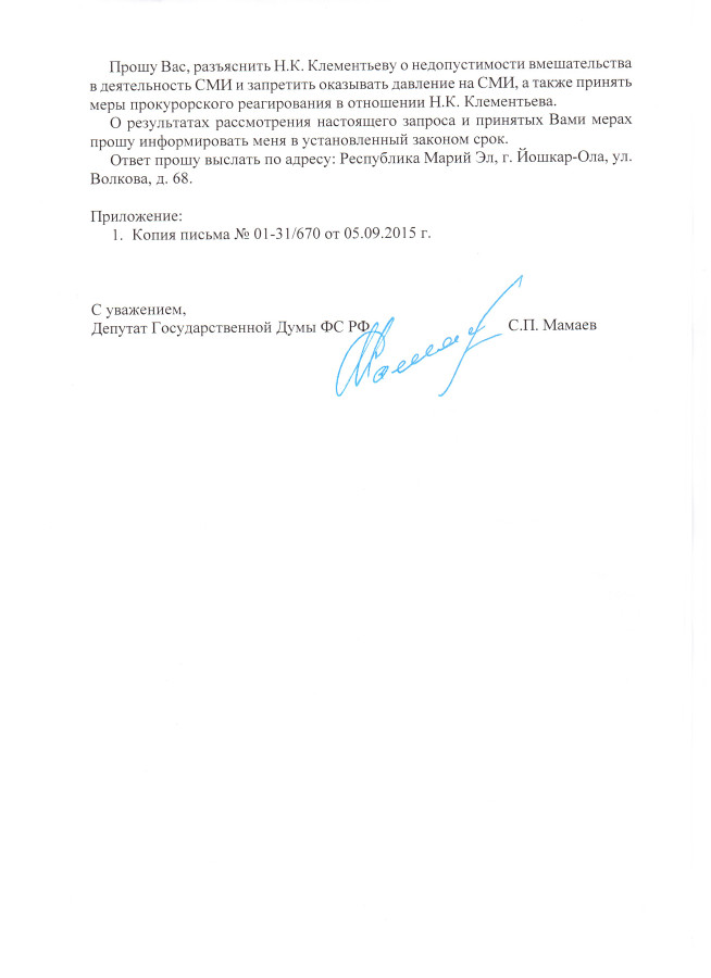 Письмо Николая Клементьева в адрес журналистов – это ни что иное, как давление на средства массовой информации, которые выражают свою независимую точку зрения на проведение предвыборной компании в Марий Эл, а также указывают на грубые нарушения законодательства о выборах.